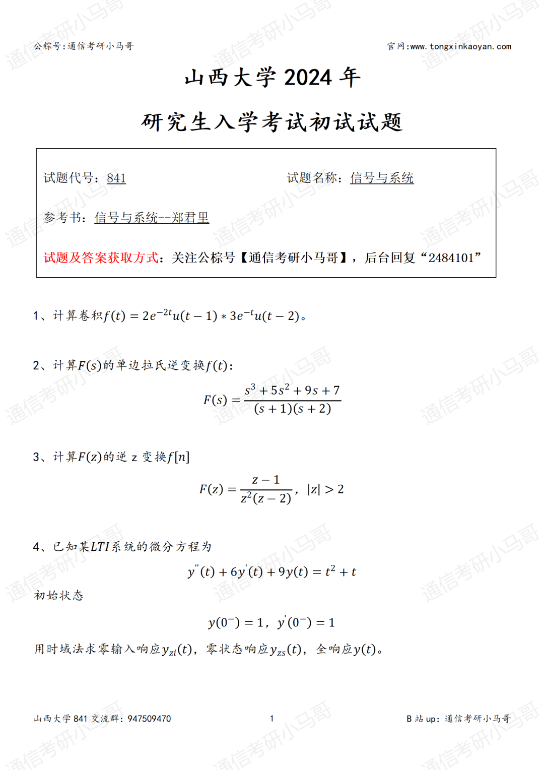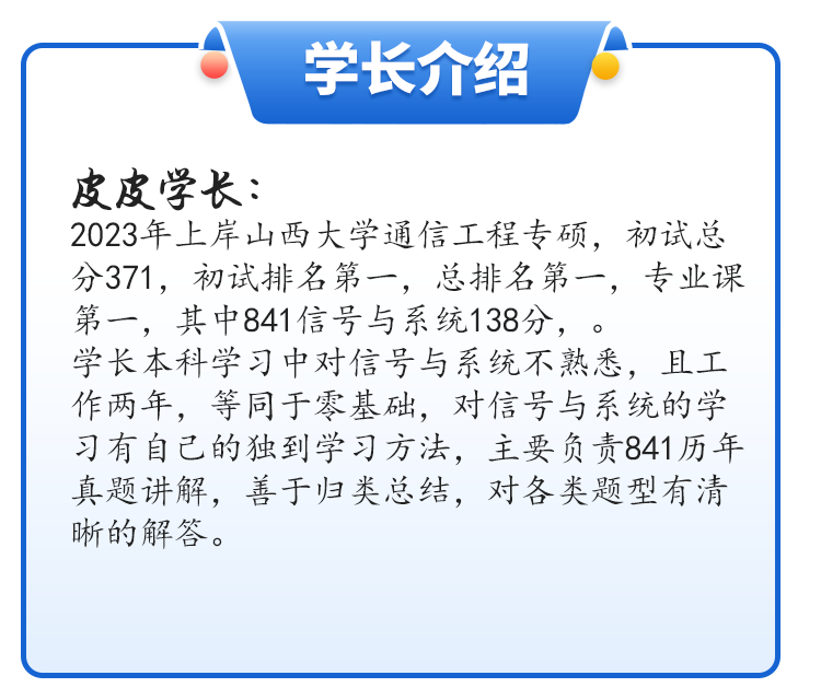 【信号三天冲刺营】 最新强化冲刺课程+配套讲义免费领 3天时间冲刺3个最最最提分的核心内容 每天配套课程+谷哥手写笔记+课后作业 每天都有高分上岸学长学姐免费答疑 (本期体验课限额200人参与!) 扫码添加助教,回复【冲刺营】~ 关于真题班 今年小马哥联合了一位山西大学841上岸的学长精心制作了一个山西大学841的真题班。 目前专业课正在冲刺阶段,院校真题尤其重要,山西大学841真题班不仅有十年的纸质真题,更有高分学长对十年真题进行详细的讲解,帮助你吃透真题,同时学长也会在真题群里面进行真题答疑,感兴趣的同学可以了解