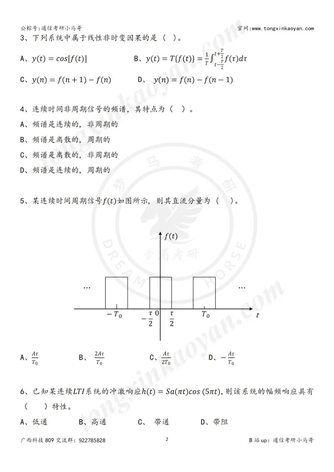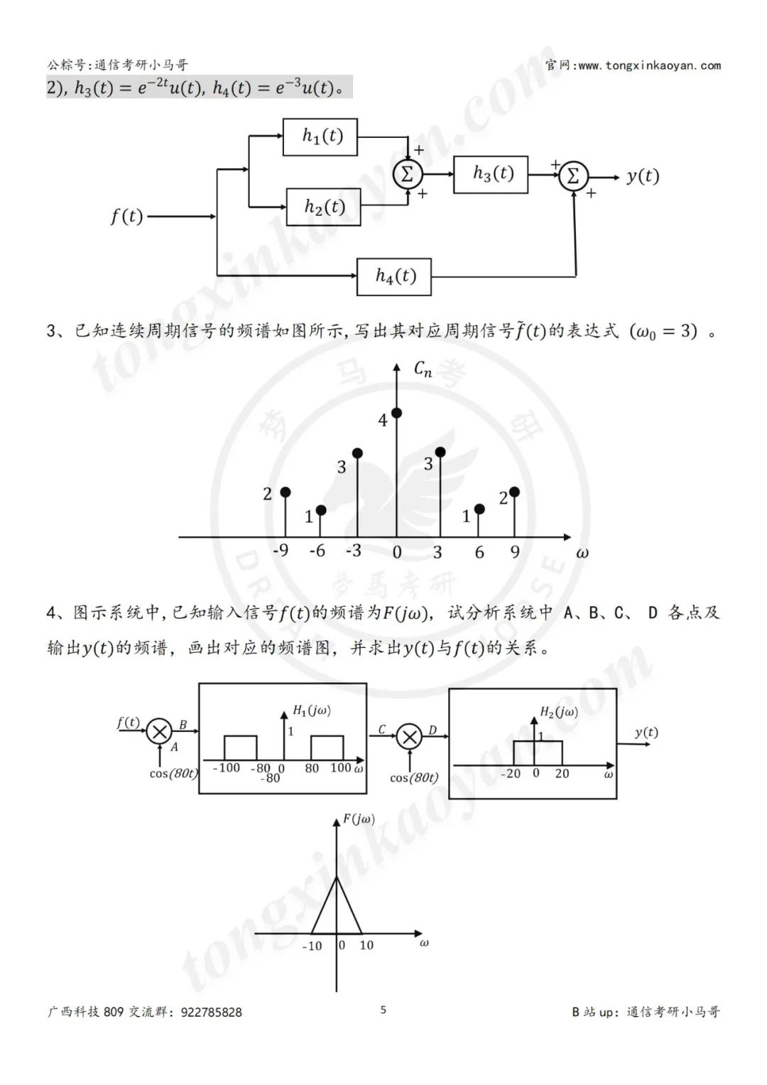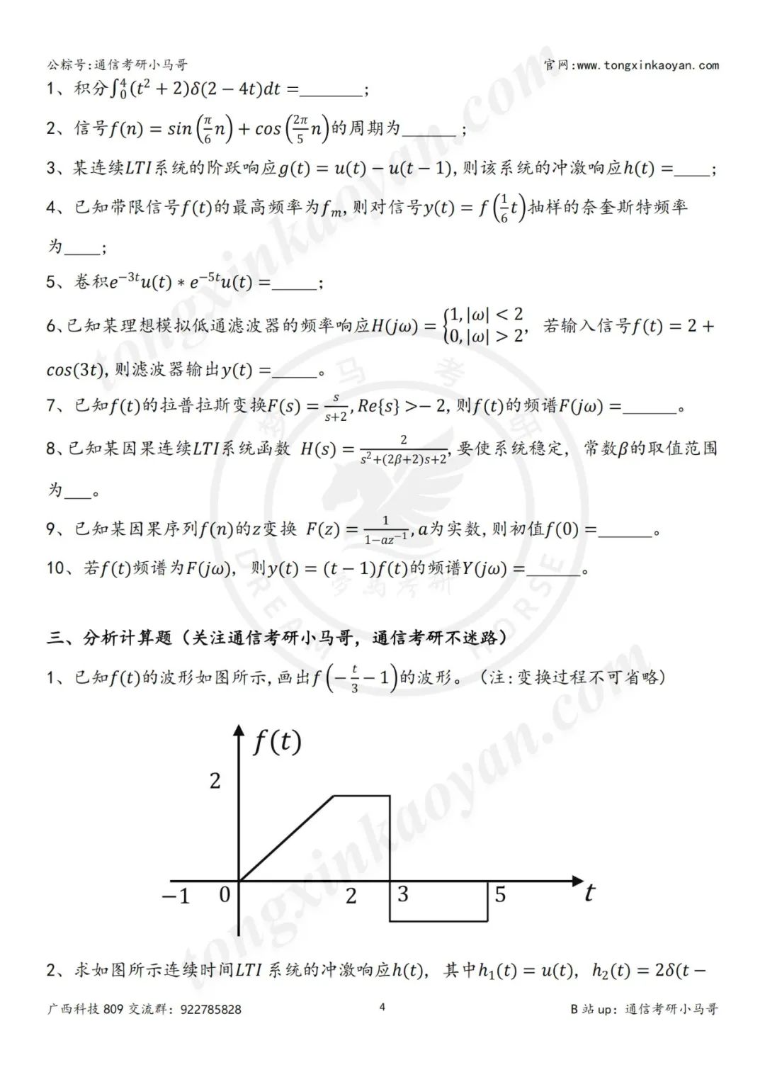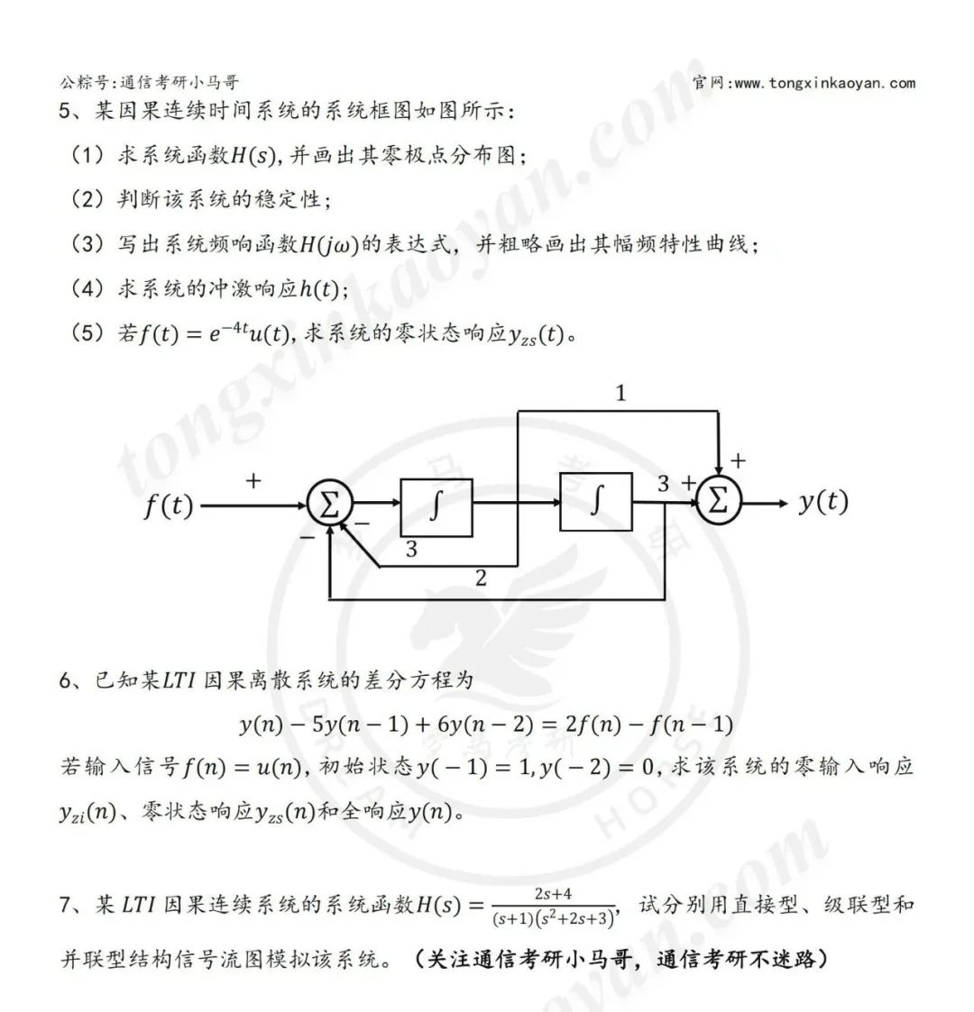 一、本套真题考察知识点(包括但不限于): 冲激函数的性质 奈奎斯特抽样定理 根据波形求解信号表达式 傅里叶变换以及逆变换的求解 判断系统稳定性 信号卷积计算 零极点图 无失真传输系统 傅里叶反变换公式 零状态响应的求解 求解信号拉氏变换以及逆变换 求解信号Z变换以及逆z变换 初值定理 信号波形关系 频谱图 信号的直流分量求解 卷积公式 三大变换的基本性质,比如微分和积分性质 冲激函数的基本性质 尺度变化和时移对波形以及幅频的影响 框图的正确理解 零状态和零输入响应的求解 真题详细解析领取,请于公众号后台回复:24809 留个点赞和在看再走呀~ 你们是我更新的唯一动力! 请做完再看解析哦~