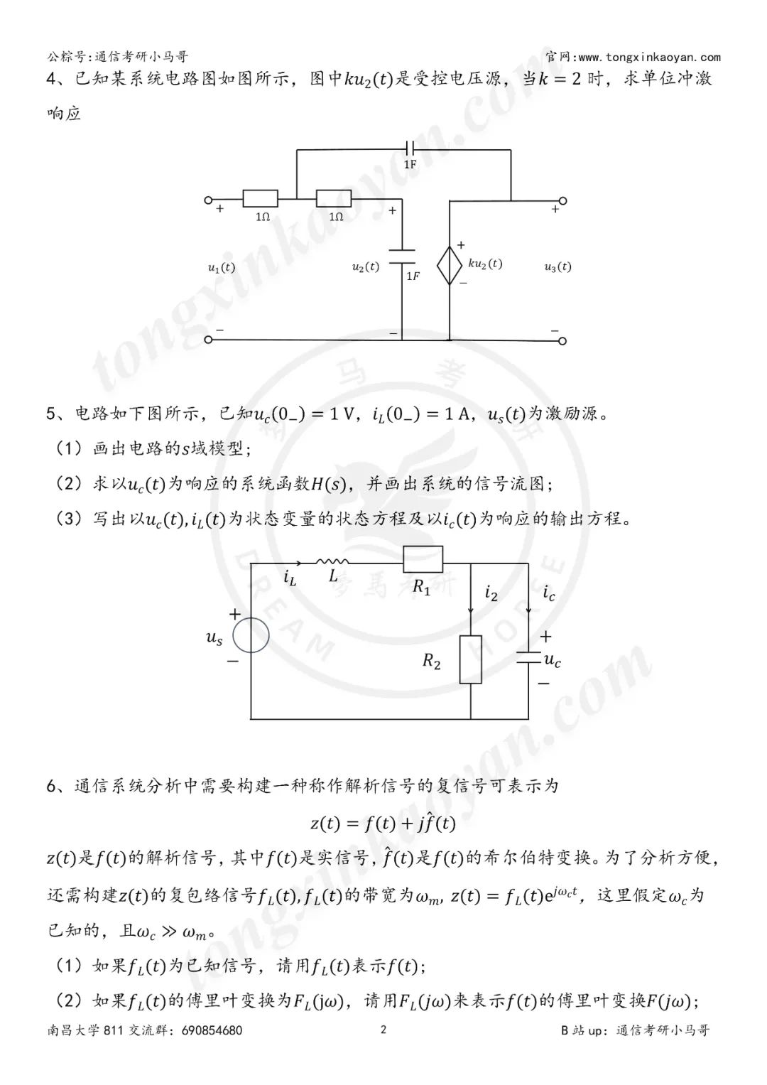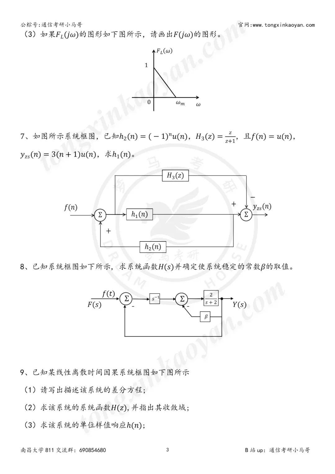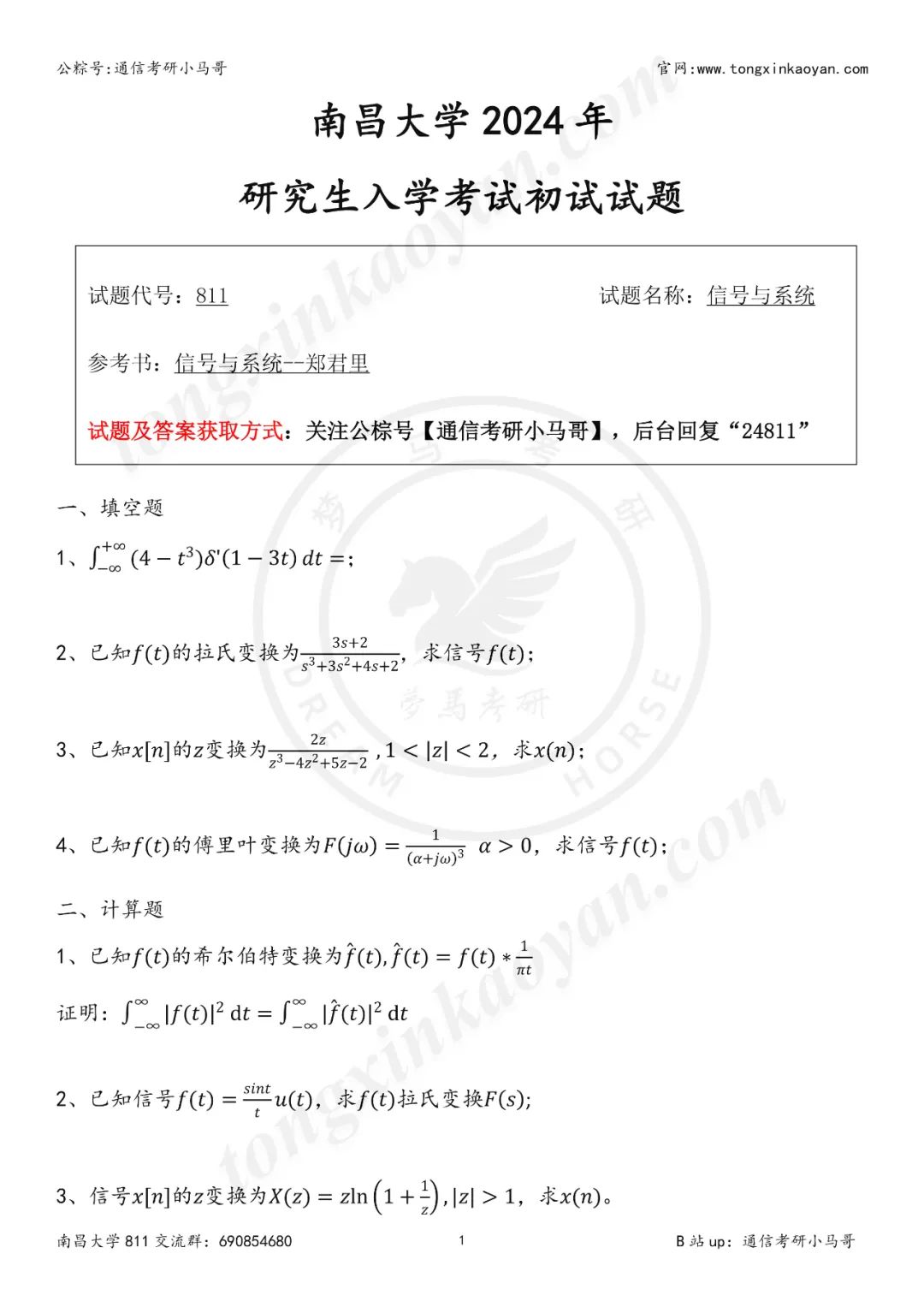 今天分享的是南昌大学811的信号与系统试题及解析。 本套试题难度分析: ①南昌大学24年有5个专业考811信号与系统,专业课录取最高分自085402通信工程,最高分145分,不愧是最“卷”的一个专业!专业课最低分来自085409生物医学工程,只有61分,最高分和最低分相差84分! ②本套试题难度中等,题型已计算分析题为主,考察的知识点主要围绕三大变换进行考察,要注意会涉及电路s域模型的考察!押题卷押中三道大题! 22、23年的真题我都做过,解析大家下面自取: