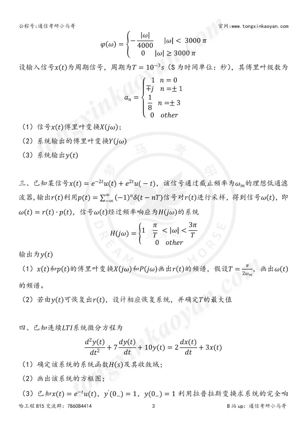 本套试题难度分析: ①该院校考察的是信号系统和电路分析的,这次发的是信号部分,电路不是我的专长,但是这套卷子很多同学管我要,电路原理部分我也会邀请b站up:犹如雨下(梦马强哥),给大家免费做出来,等我。更多电路考研资料,大家可以关注强哥的公众号 ②从信号部分来看,考察的题目都比较常见,计算量有一点难度,包含了状态方程以及多次考察周期信号求解傅里叶表达式,题目不难,可以用来练手。 22年的真题我都做过,解析大家下面自取: