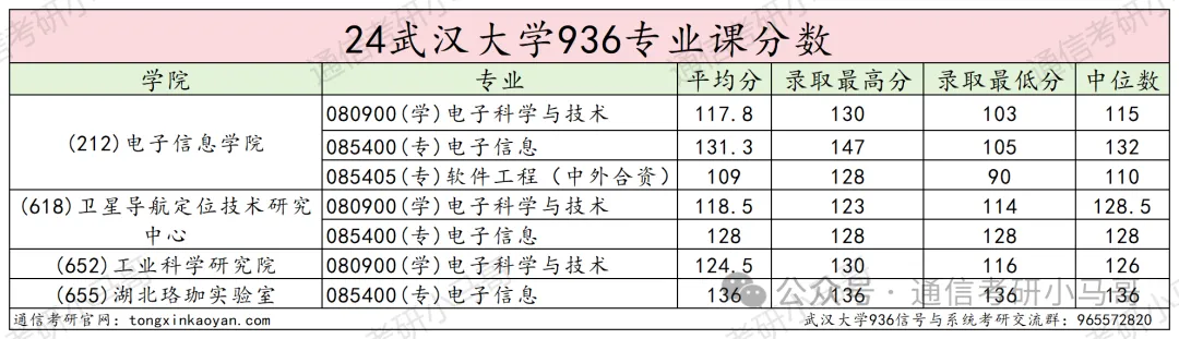 ①从数据中可以发现,武汉大学936信号4个专业的专业课平均分在120分以上,专业课最高分147分(电信学院电子信息专业),最低分90分(电子信息学院软件工程专业)