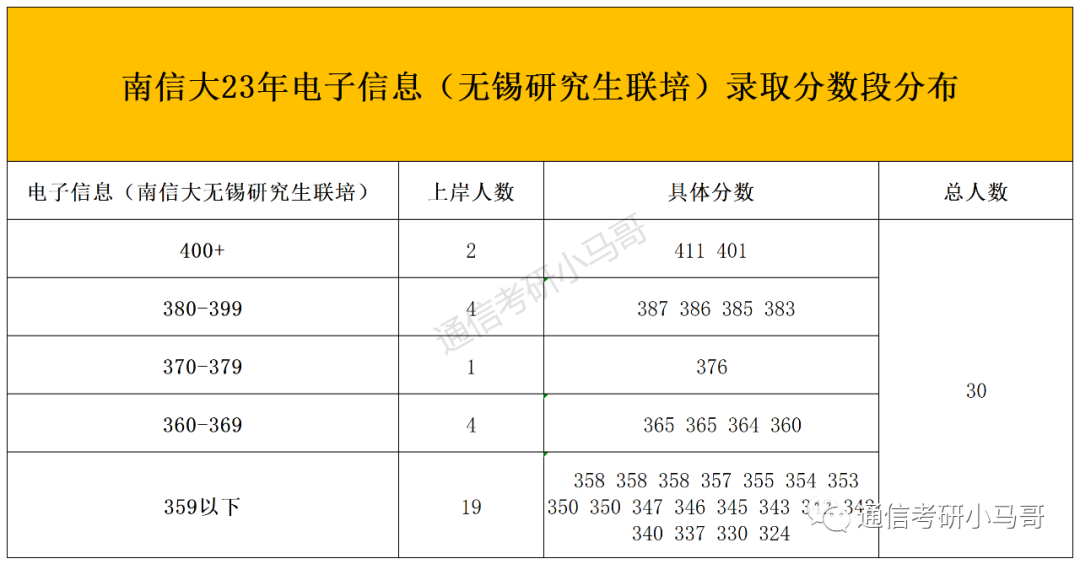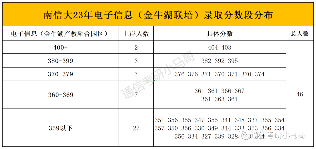 ①:结合上面的数据可以看出,南信大的竞争还是很大的,高分也比较多,尤其是电子信息(电子与信息工程学院)380+的同学占大部分,甚至400+的同学也有35位,可以说大家都是非常的“卷”了。