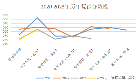 ②:可以看到电子信息(电信学院)的分数线一直稳定在300+分,但在23年达到了366分,爆涨45分。而电子信息(中科芯)分数线处于270-280的阶段,是近几年最为稳定的专业,预计24年也趋于稳定状态。其他联培方向也有稳步上升的趋势,今年电子信息(国科)的分数线从313分降到了278分(降35分),可能跟国科临时扩招了22人有关(从10人到32人),所以个人认为分数下降没有太大的参考价值。