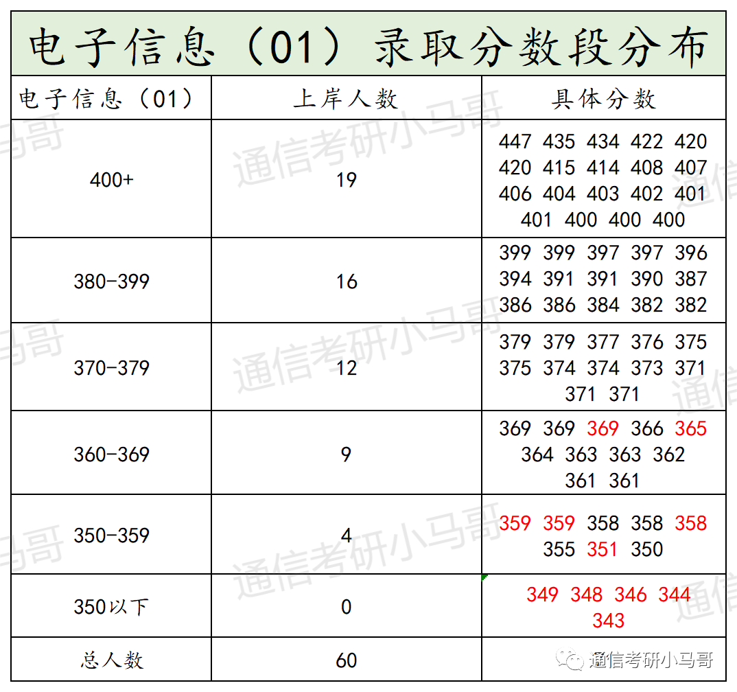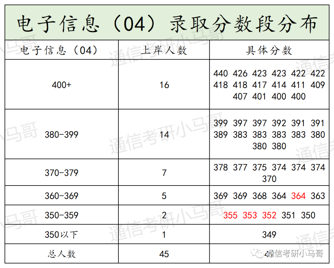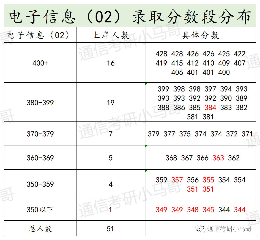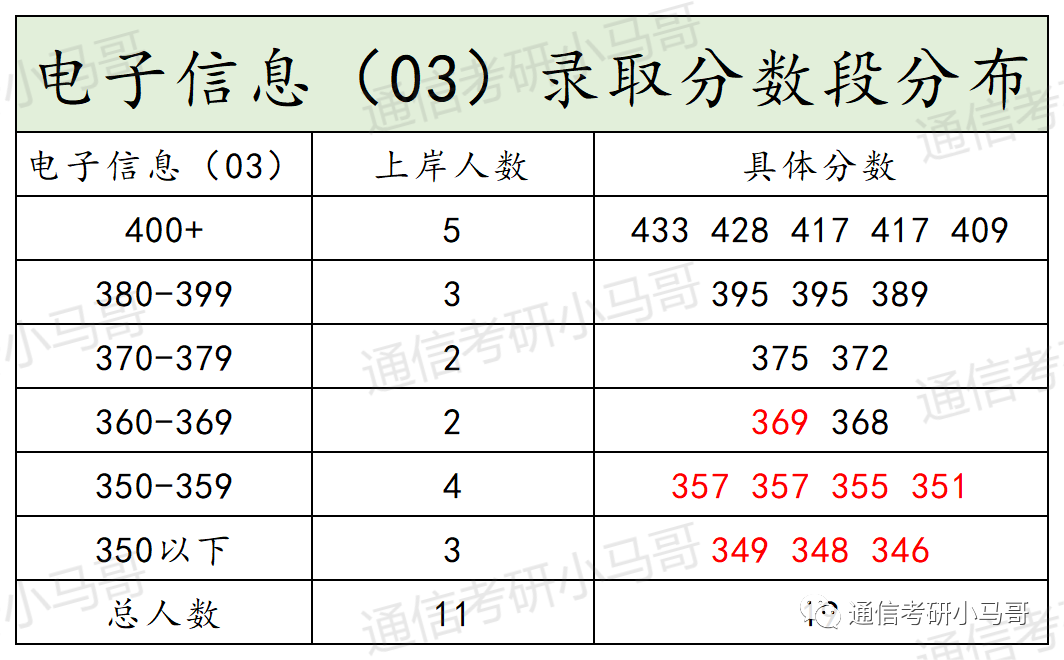 ① 因为所有研究考试科目均一致,所以通过分数就可以看出每个专业竞争压力大小。其中电子信息01方向400以上19人,电子信息02方向400以上16人,电子信息03方向400以上5人,电子信息04方向400以上16人。400+以上一共有56人。占比56/167=33.5%,也就是每3个上岸的里面就有1个400+。所以孩子们,不是题目越简单,上岸就越容易,你简单别人也简单。