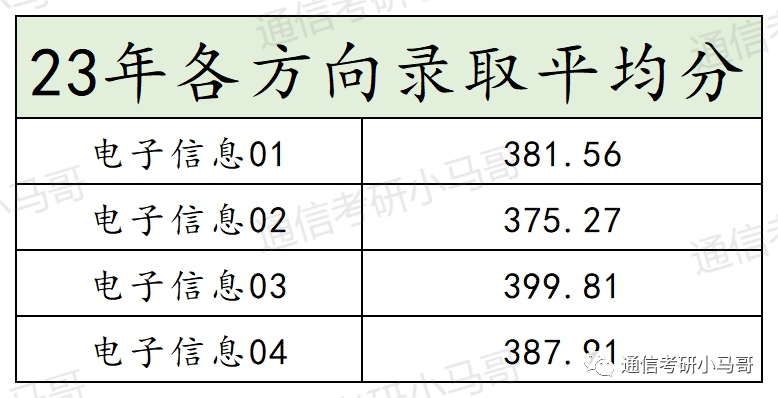 可以看到四个研究方向的平均分都不低,尤其是电子信息03竟然高达399.81分!其他的三个方向都在370以上,如此惊人的分数线,即使专业课和公共课简单,也看得出来大家都非常努力了。