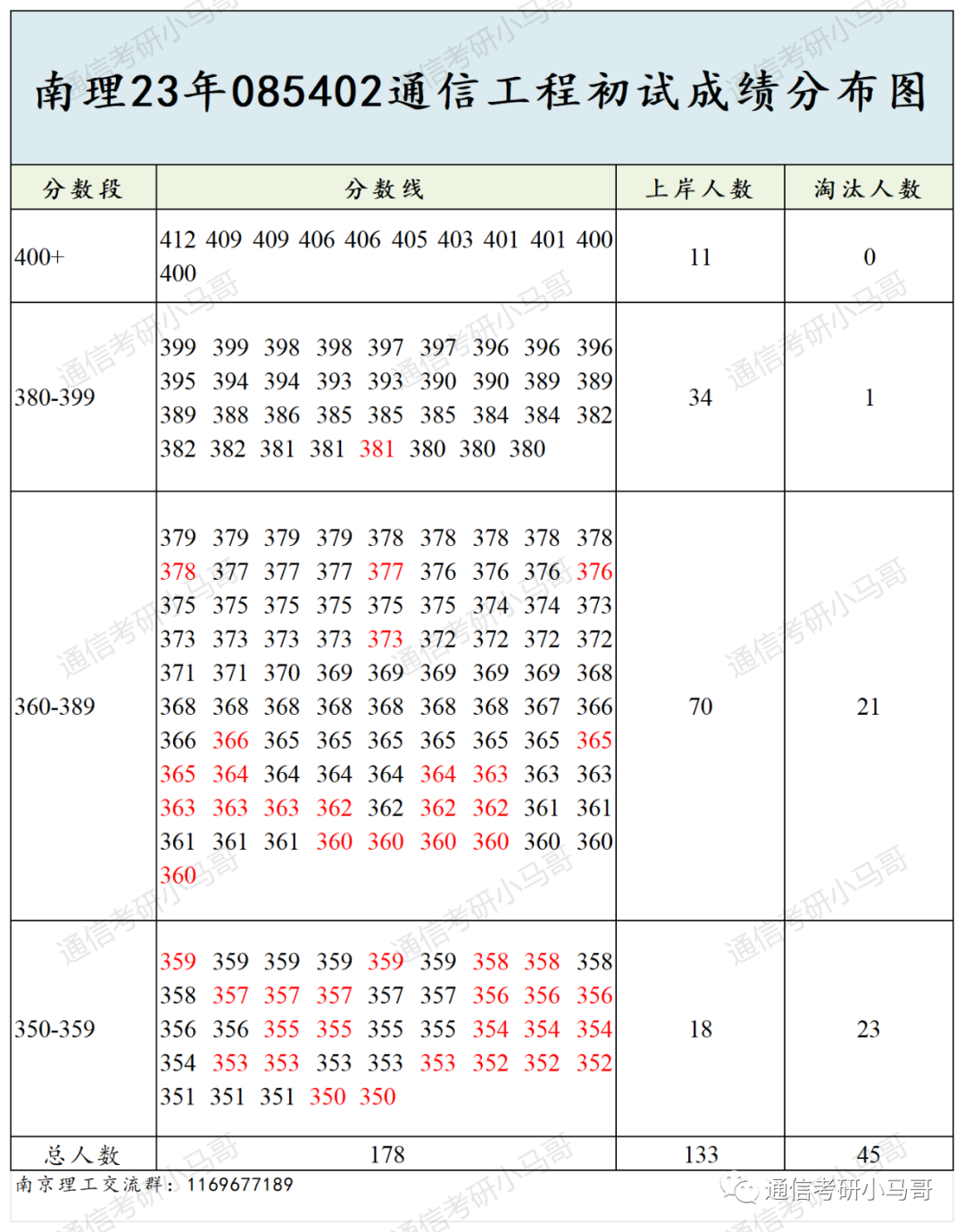 ③专硕085402通信工程平均分378,最高分412,最低分351,分差61。