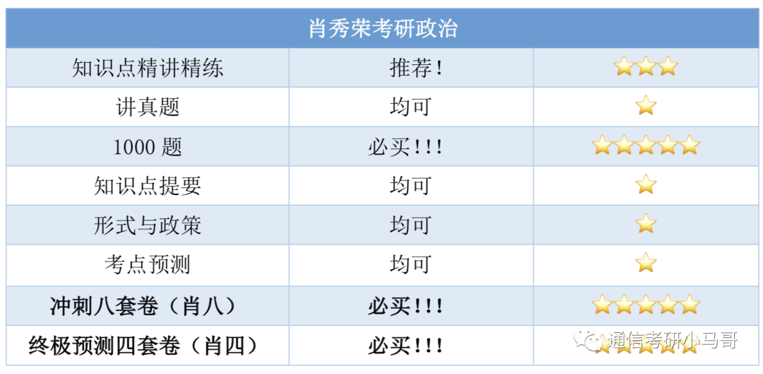 肖老的大名应该也不用笔者赘述,每年的肖八肖四是多少考研人的救命宝典,可以说是人手一份,那肖老的其他书和课程呢?具体书籍列举在下面表格中,1000题、肖八和肖四是必买的,知识点精讲精练可按需选择,有时间空余的情况下作为补充。