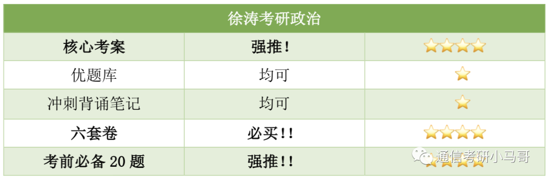 徐涛老师的知识点讲解的非常清楚易懂,幽默风趣,适合在前期打基础,推荐选择徐涛老师的强化课搭配核心考案进行学习(基础班可以不听)。由于后期十一月左右是需要大量刷题的,所以主流老师出的套题建议大家至少都做一遍,其中也就包括了徐涛老师的六套卷。考前必备20题也是在学有余力的情况下作为补充,因为肖四的主观题可以说是所有人都会背的,以防万一可以在徐涛老师和腿姐陆寓丰的押题材料中二选一作为补充。