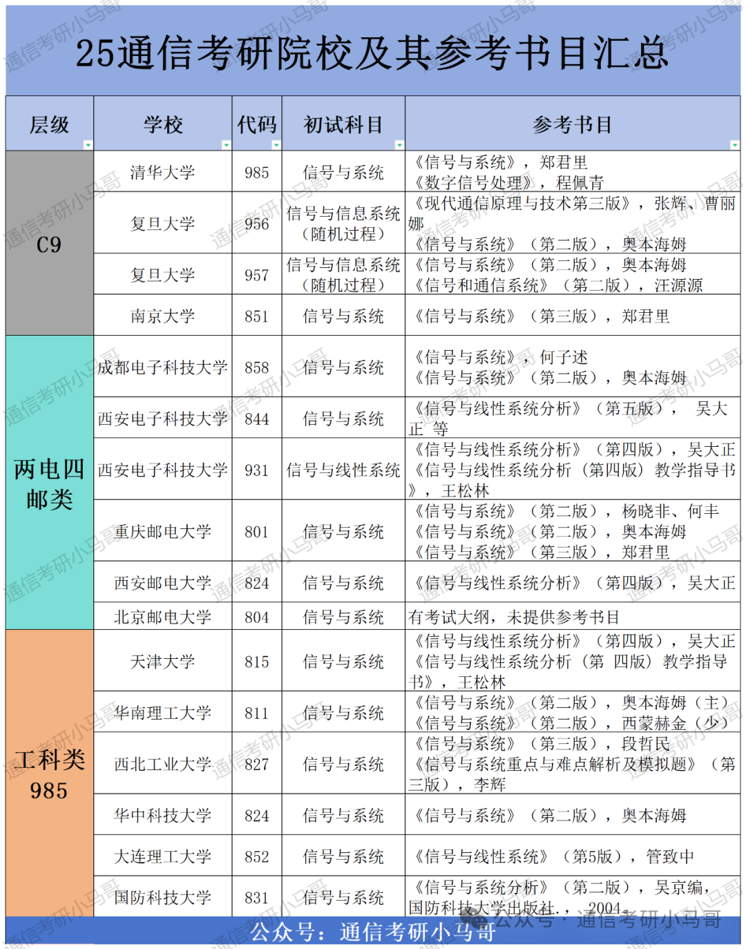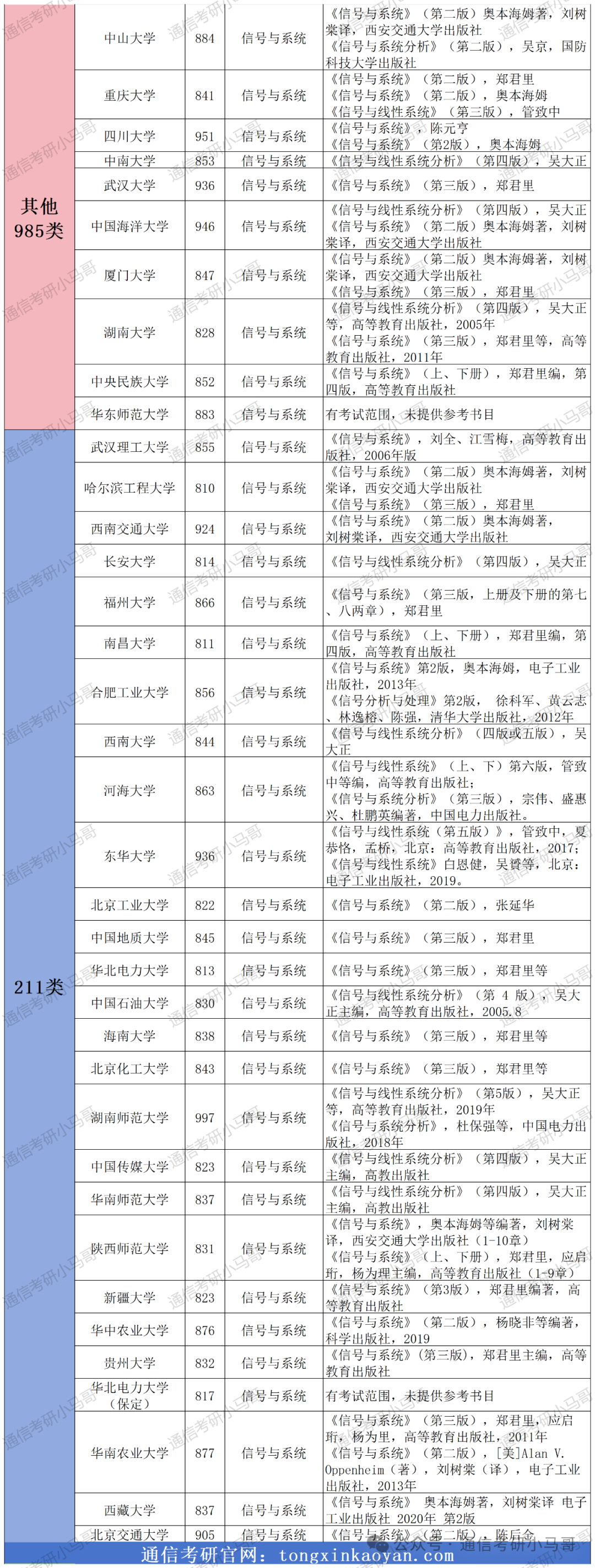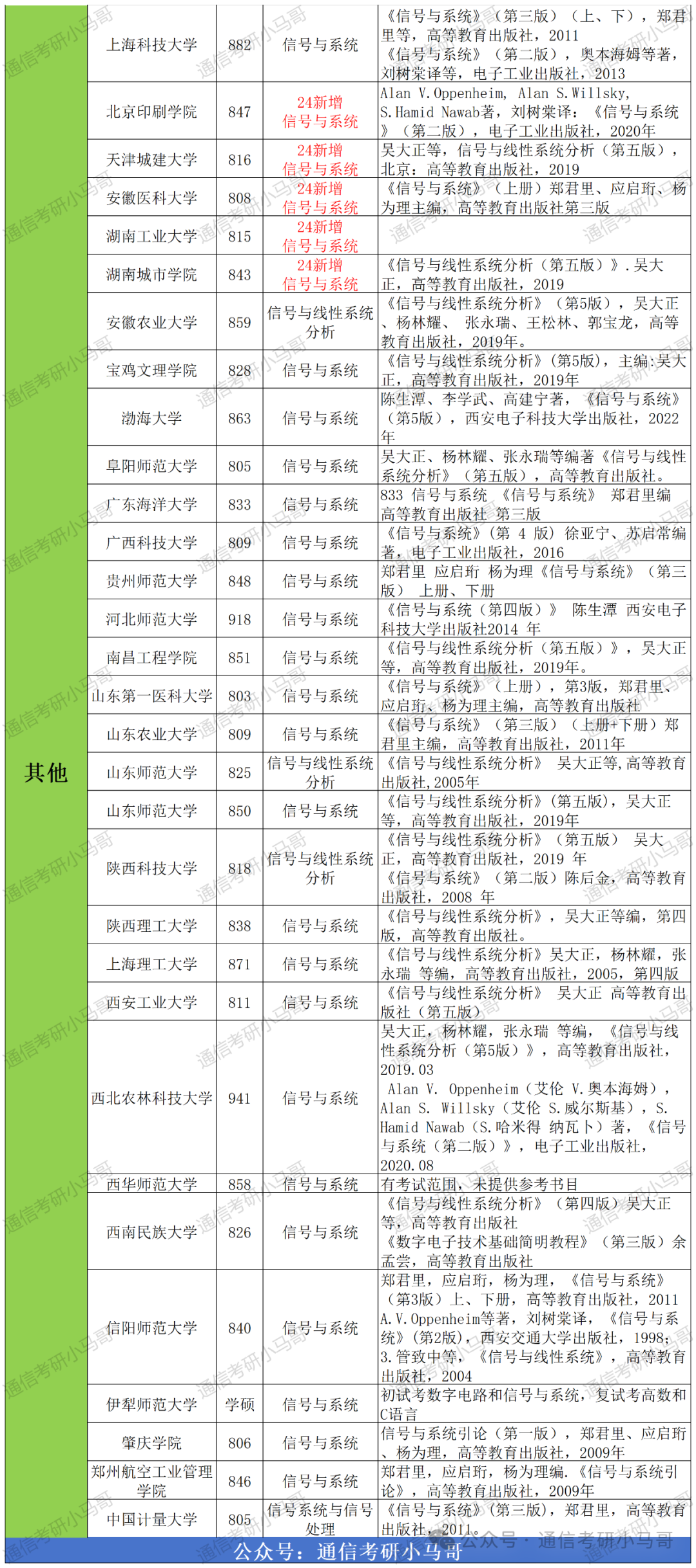 【25最新】通信考研192所院校及参考书目汇总通信考研小马哥1年前更新关注私信01096 这段时间我也是在各大高校官网搜集最新的信息,并帮大家整理了最新的192所通信考研院校汇总,让大家在择校方面可以有很好的参考。我之前也做了很多择校分析,如果大家想了解相关院校的详细情况可以翻翻看我之前的文章哦,链接我会放在下方! 一、25通信考研院校汇总 红色为24年新增考信号的学校。 图:25通信考研院校汇总 山东科技24改成了824电路、信号与系统 © 版权声明文章版权归作者所有,未经允许请勿转载。THE END最新资讯# 通信考研# 院校汇总# 参考书目 喜欢就支持一下吧点赞6 分享QQ空间微博QQ好友海报分享复制链接收藏